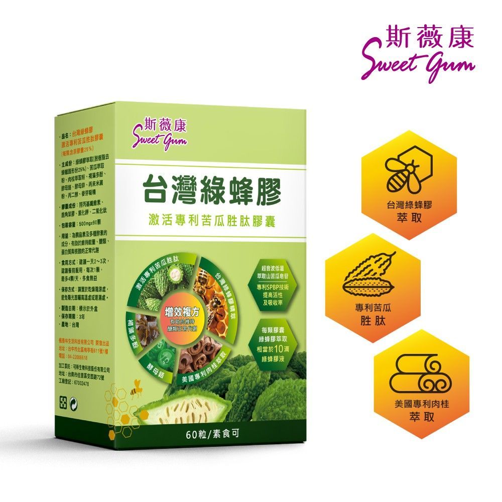 Sweet Gum 斯薇康 台灣綠蜂膠激活專利苦瓜胜肽膠囊60粒x1盒-含台灣綠蜂膠萃取+專利山苦瓜